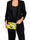 Material y color externo: Cuero amarillo con estampado de palmeras.