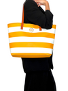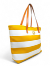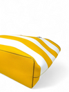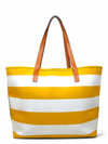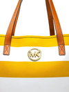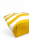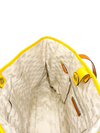 Material y color externo: Cuero saffiano con franjas amarillas y blanca, detalles en cuero café.