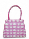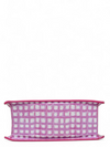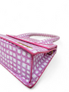Material y color externo: Cuero con patrón a cuadros rosado y blanco. Material y color interno: Tela beige. Detalles internos: 1 Compartimento, 1 Bolsillo. Color de herrajes: Dorado. Forma de cerrar: Magnético. Incluye: Bandolera removible.