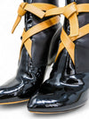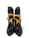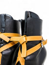Material y color: Cuero negro con inserciones de charol y correas en cuero camel.