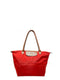 Cartera “Le Pliage Type M” marca Longchamp en lona azul oscuro, cuero café en las asas, extremos del cierre y solapa, herrajes grises oscuros y broche de cierre dorado, interior negro con bolsillo deslizante y cierre en la parte superior.