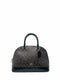 Cartera "Lipstick" marca Carolina Herrera con monogramas CH en lona marrón y rojo, parte inferior y asa plana en cuero café, herrajes dorados, forro interior de lona con un bolsillo y cierre en la parte superior.