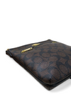 Material y color externo: Lona café con mongramas y cuero negro. Material y color interno: Tela café. Detalles internos: 1 Compartimento, 1 Bolsillos interno, 1 Bolsillo externo. Color de herrajes: Dorado. Forma de cerrar: Cremallera.