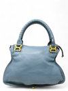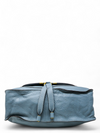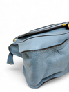 Material y color externo: Piel de becerro granulada en tono azul. Material y color interno: Tela café. Detalles internos: 1 Compartimento, 2 Bolsillos internos, 1 Bolsillo externo. Color de herrajes: Dorado. Forma de cerrar: Cremallera. Incluye: Bandolera removible, tarjeta de autenticidad.