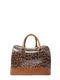 Cuero blanco con detalles de flores rojas, hojas verdes y círculos negros.