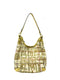 Cartera marca Michael Kors en tela azul con herrajes dorado, dos correas planas para los hombros en cuero café, cordón redondo en tela beige con borlas en cuero cafe entrelazado en ojales redondos dorados en la parte superior, cierre magnético en la parte superior, interior en jacquard con logo color crema, cinco bolsillos interiores; uno con cierre de cremallera y cuatro deslizantes.