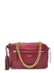 Cartera marca Coach en tela café con monogramas, herrajes plateados, asa y ribete superior en charol morado, forro interno en tela morada, un bolsillo interior deslizante y cierre en la parte superior.