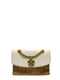 Cartera marca Michael Kors en plástico color oro rosa con monogramas, herrajes en color ocre, pies protectores, bandolera ajustable removible, asas dobles enrolladas, forro interno beige, cinco bolsillos internos; uno de ellos con cierre de cremallera y cierre de cremallera en la parte superior.