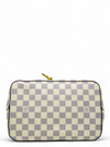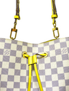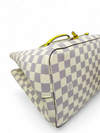 Material y color externo: Lona Damier Azur con detalles en cuero amarillo. Material y color interno: Microfibra amarilla con acabado similar al ante. Detalles internos: 3 Compartimentos. Color de herrajes: Dorado. Forma de cerrar: Haladera. Incluye: Dust bag, bandolera removibles, manual de cuidados, tarjeta de regalo .