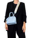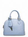 Material y color externo: Cuero Epi azul. Material y color interno: Microfibra azul con acabado similar al ante. Detalles internos: 1 Compartimento, 1 Bolsillo. Color de herrajes: Plateado. Forma de cerrar: Cremallera. Incluye: Dust bag, bandolera removible, candado y llaves.