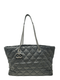 Cartera marca Chanel en cuero acolchado negro, herrajes en tono plateado envejecido, dos asas en eslabones de cadena, logotipo CC grabado en la base, incluye dos bolsillos de cierre de cremallera externos, forro interior en tela a tono, incluye cinco bolsillos internos; uno con cierre de cremallera y cierre de cremallera con haladera CC en la parte superior. Incluye dust bag.
