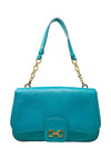 Material y color externo: Cuero saffiano en tono aguamarina. Material y color interno: Jacquard café. Detalles internos: 1 Compartimento, 2 Bolsillos internos, 1 Bolsillo externo. Color de herrajes: Dorado. Forma de cerrar: Broche. Accesorios: Dust bag.