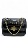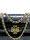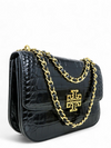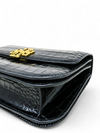 Material y color externo: Cuero negro con efecto de piel de cocodrilo. Material y color interno: Tela beige. Detalles internos: 2 Compartimentos, 1 Bolsillo interno, 1 Bolsillo externo. Color de herrajes: Dorado. Forma de cerrar: Magnético.