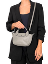 Material y color externo: Cuero gris. Material y color interno: Jacquard negro con logo. Detalles internos: 1 Compartimento, 1 Bolsillo. Color de herrajes: Negro. Forma de cerrar: Cremallera.