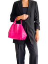 Material y color externo: Cuero fucsia. Material y color interno: Cuero fucsia. Detalles internos: 1 Compartimento. Color de herrajes: Dorado. Forma de cerrar: Correa. Accesorios:Dust bag.