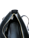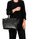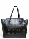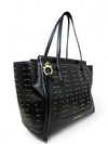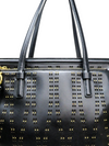 Material y color externo: Cuero negro con detalles de taches y perforaciones. Material y color interno: Satín negro. Detalles internos: 1 Compartimento 1 bolsillo interno, 1 Bolsillo externo. Color de herrajes: Dorado. Forma de cerrar: Cremallera. Incluye: Dust bag.