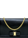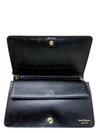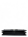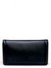 Material y color externo: Cuero negro. Material y color interno: Cuero negro Detalles internos: 2 Compartimentos, 3 Bolsillos, 7 Ranuras para tarjetas. Color de herrajes: Dorado. Forma de cerrar: Botón a presión Incluye: Cadena removible.