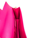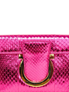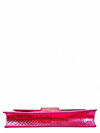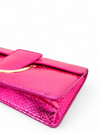 Material y color externo: Cuero rosa metalizado con textura de piel de serpiente. Material y color interno: Cuero rosado. Detalles internos: 1 Compartimento, 1 Bolsillo. Color de herrajes: Dorado. Forma de cerrar: Magnético. Incluye: Bandolera removible.