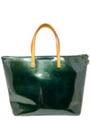 Material y color externo: Charol verde oliva. Material y color interno: Tela verde oliva. Detalles internos: 1 Compartimento, 2 bolsillos. Color de herrajes: Dorado. Forma de cerrar: Cremallera. Accesorios: Dust bag.