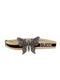 Correa marca Gucci en lona negra con franja de los colores emblemáticos de la marca en la parte inferior, hebilla plateada grabada con "Gucci" y dos anillos en forma "D".