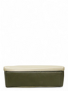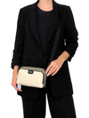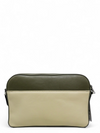 Material y color externo: Cuero verde oliva y beige. Material y color interno: Jacquard negro con logo. Detalles internos: 1 Compartimento, 2 Bolsillos internos, 2 Bolsillos externos. Color de herrajes: Plateado. Forma de cerrar: Cremallera. Incluye Bandolera y monedero removibles.