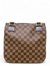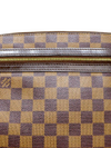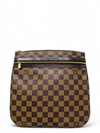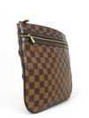 Material y color externo: Lona Damier Ebene. Material y color interno: Tela café. Detalles internos: 1 Compartimento, 1 Bolsillo interno. Color de herrajes: Dorado. Forma de cerrar: Cremallera. Incluye:Dust bag.