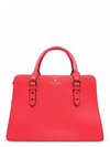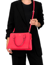 Material y color externo: Cuero rosado. Material y color interno: Jacquard rojo con logo. Detalles internos: 3 Compartimentos, 3 Bolsillos. Color de herrajes: Dorado. Forma de cerrar: Cremallera y magnético. Incluye: Bandolera removible.