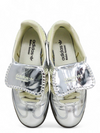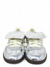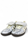 Material y color: Cuero plateado metalizado con acabado de charol y detalles bordados.