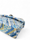 Material y color externo: Tela de rayas azules con estampado paisley, adornado con cristales plateados.