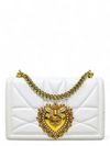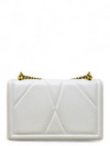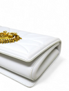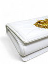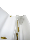 Material y color externo: Cuero blanco. Material y color interno: Cuero blanco. Detalles internos: 1 Compartimento, 1 Bolsillo. Color de herrajes: Dorado. Forma de cerrar: Broche.