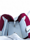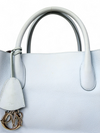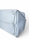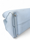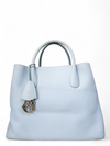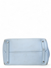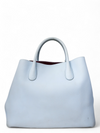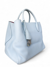 Material y color externo: Piel de becerro granulada en tono azul cielo. Material y color interno: Piel lisa morada. Detalles internos: 1 Compartimento, 3 Bolsillos. Color de herrajes: Plateado. Forma de cerrar: Broche giratorio. Incluye: Bandolera removible.