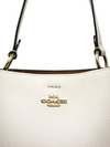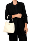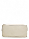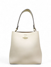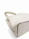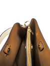 Material y color externo: Cuero en tono blanco cálido. Material y color interno: Cuero café. Detalles internos: 3 Compartimentos. Color de herrajes: Dorado. Forma de cerrar: Magnético y cremallera.