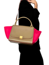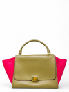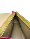 Material y color externo: Cuero beige y fucsia. Material y color interno: Cuero beige. Detalles internos: 1 Compartimento, 2 bolsillos internos, 1 bolsillo externo . Color de herrajes: Dorado. Forma de cerrar: Broche. Incluye: Bandolera ajustable y removible.