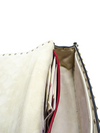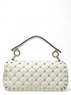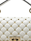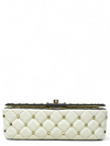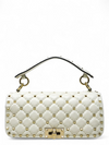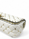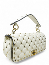 Material y color externo: Piel acolchada en color marfil clara con patrón de rombos y detalles de taches. Material y color interno: Piel natural. Detalles internos: 1 Compartimento, 2 Bolsillos. Color de herrajes: Dorado. Forma de cerrar: Broche giratorio. Incluye: Dust bag, bandolera y cadena removibles, etiqueta, manual de cuidados.
