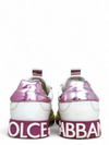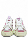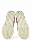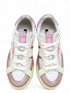 Material y color: Cuero blanco, ante gris con detalles en charol rosado y engomados a contraste.